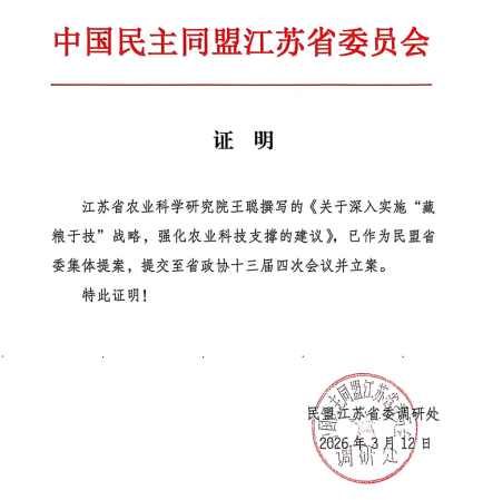 近日,由我院民盟委员会盟员王聪撰写的《关于深入实施“藏粮于技”战略,强化农业科技支撑的建议》,经民盟江苏省委员会审定完善,作为省级集体提案提交江苏省政协十三届四次会议,现已通过大会提案审查委员会审查,正式立案。